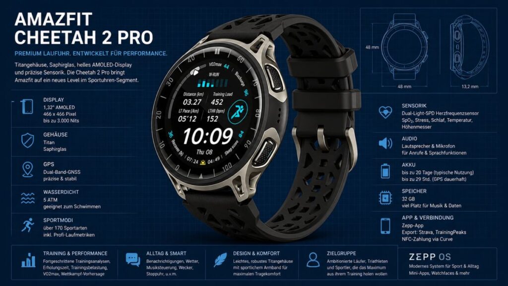 Mit der Cheetah 2 Pro schiebt Amazfit seine Laufuhr-Serie spürbar Richtung Premium. Titangehäuse, Saphirglas, ein 1,32 Zoll großes AMOLED mit 466 x 466 Pixeln und bis zu 3.000 Nits sowie 32 GB Speicher lesen sich erst einmal nach einem deutlichen Upgrade gegenüber vielen klassischen Amazfit-Modellen. Dazu kommen Dual-Band-GNSS, 5 ATM, Lautsprecher, Mikrofon, Temperatursensor, Höhenmesser und ein Akku, der laut Hersteller bei typischer Nutzung bis zu 20 Tage schaffen soll.