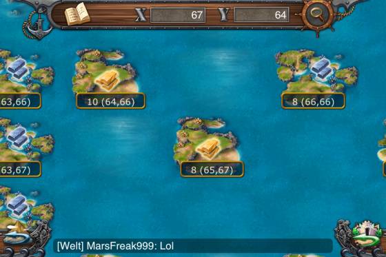Drei Kartenansichten gibt es bei Island Empire, umschaltbar unten links. Zunächst gibt es die Stadtansicht, dann die Umgebungsansicht mit deiner Insel und dann die gesamte Inselwelt. Das bringt auch gleich den zentralen Punkt von Island Empire an. Denn deine Stadt ist auf einer Insel und von Meer umgeben. Wenn du in der Weltansicht genau hinschaust, siehst du außerdem, dass jede Insel eine spezielle Ressource bietet. So gibt es auf der einen Insel nur Gold auf der anderen Eisen. Da man aber alle Ressourcen benötigt, ist man zunächst dazu aufgefordert über den Markt zu handeln. Später gibt es noch einen zweiten Weg.