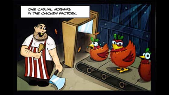 Hauptsächlich rutscht das Huhn über die hügelig geformte Landschaft. Bevor es aber auf die Reise geht, gibt es noch eine kurze Vorgeschichte. Das Raketenhuhn ist aus der Schlachtfabrik geflohen. Entsprechend ist der Hügelausflug nicht so entspannt, wie beim offenbar für die App als Vorlage dienenden Spiel Tiny Wings. Das Feuer verfolgt dich und hat es dich erreicht… naja, dazu kommen wir später. Bis es soweit ist, darfst du hoffnungsvoll durch verschiedene Welten rutschen und fliegen.