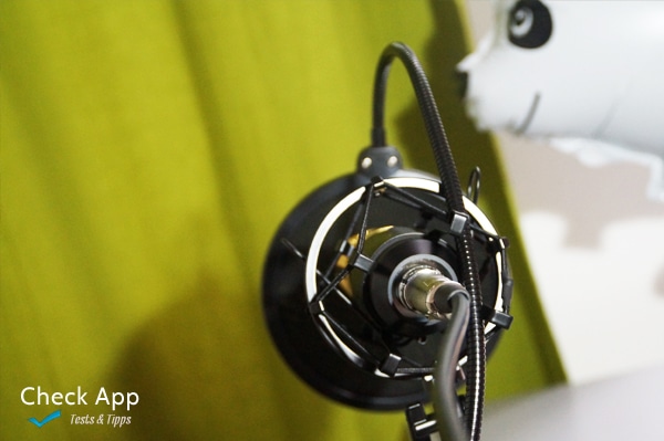 Am Arm befestigt wird das Mikro mit der Spinne. Hier wird es fest eingesteckt und fixiert, ein Gewinde für andere Halterung ist vorhanden. Die Mikrofonspinne ermöglicht eine gedämpfte erschütterungsfreie Halterung am Stativ. Zudem ermöglicht dieses letzte Stück nochmals zwei Abwinkelungen des Arms. Das Mikro selbst flasht beim Design mit seinem schwarz-goldenen Look. Dieser sieht etwas poppig aus. Am zylinderartigen Gehäuse des Gadgets selbst gibt es nicht viel zu entdecken. Alles sauber verarbeitet und in der Hand liegt es mit etwa 200 Gramm recht leicht. Es ist 16 cm lang und etwa 5-6 cm im Durchmesser.