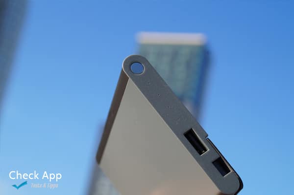 An der Seite der ionbank Powerbank befindet sich ein USB-Port fürs Energie teilen mit einem weiteren Gerät und ein Tippschalter, welcher mit vier weißen LED den Ladezustand der Powerbank anzeigt zwischen 25 und 100 Prozent. Durch den Anschluss ist die Powerbank auch für diejenigen etwas, welche vielleicht mit Android gleichzeitig unterwegs sind und dort vielleicht sogar USB C benötigen.