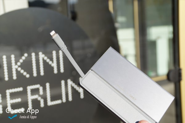 Zwei Kabel sind ausklappbar unter einer Lederklappe versteckt: ein Lightning- als auch über ein USB-Kabel. Das eine dient dazu, alle Apple Geräte mit dem aktuellen Anschluss aufzuladen, das andere dazu, die Powerbank am Netz zu erfrischen. Der SmartSense-Schaltkreis sorge dafür, dass man die Powerbank nutzen und gleichzeitig aufladen kann. Das ist wohl nur dann relevant, wenn man nur einen Adapterstecker dabei hat. Beide Kabel sind recht kurz, in Flachbandausführung und drehbar gelagert. Über ihnen verschließt sich die Klappe magnetisch. Diese besteht trotz der Optik mit Narben auf der Oberfläche und weicher Innenseite nicht aus tierischer Haut, sondern aus „veganem Leder“ wie der Hersteller schreibt. Also einem künstlichen Stoff.