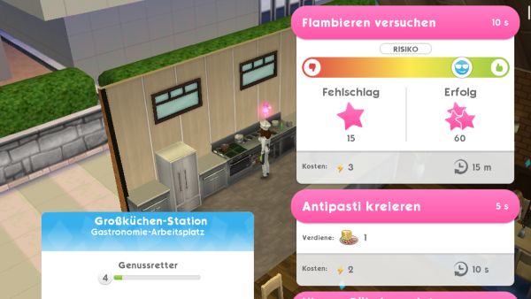 Es gab da auch Probleme. Erst wenn man ab Level 7 ein Kochhobby haben kann und somit den Herd kaufen, war es möglich einen Basar vorzubereiten und diesen Wunsch zu erfüllen. Später dann konnte man bei Level 4 des Kochhobbys den Mixer kaufen und den „Kochwettbewerb (fortgeschritten)“ als Hobby-Ereignis erfüllen. Mal schauen, wie dies jetzt bei Sims Mobile gelöst ist.