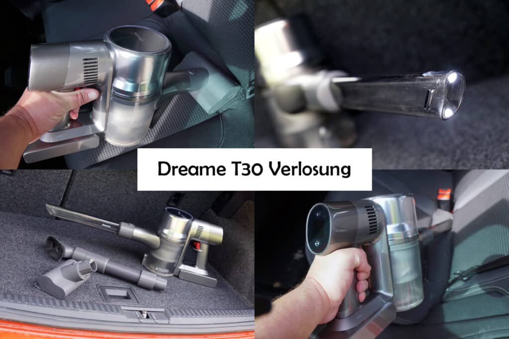 Wir verlosen einen Akkustaubsauger Dreame T30 im Wert von circa 360 Euro und anlässlich des Feiertags für die Männer muss natürlich der Vorschlag in den Beitrag, dass man mit ihm ganz hervorragend das Kraftfahrzeug saugen kann. Natürlich kannst du auch das Wohnzimmer, den Einhornstall oder dein Hausboot saugen. Er hat eine lange Akkulebensdauer, krasse Saugleistung und im Lieferumfang sind gleich mehrere geeignete Düsen für Spalten zwischen den Sitzen oder für eine Tiefreinigung der Polsterbezüge. Die beleuchtete Spaltdüse ist wortwörtlich ein Highlight. Wir haben den T30 hier in der Praxis genutzt und waren begeistert wie voll der beutellose Staubbehälter nach der Säuberung des Fahrzeuginnenraums war, wie kann der Dreame T30 soviel Schmutz aufsaugen? Das Auto war doch erst frisch gesaugt an der Waschstraße. Hehe: