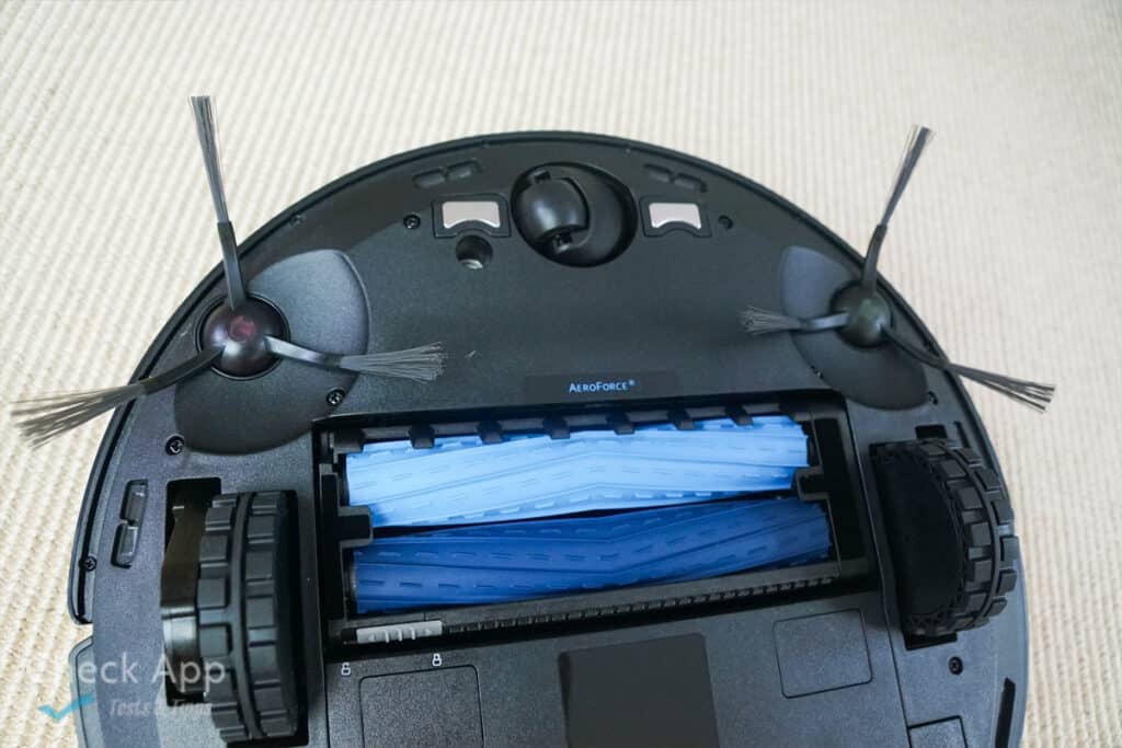 Die beiden Bürsten sind rot und grün markiert, sodass man sie richtig anbringt. Sie seien doppelseitig, sodass sie noch mehr Staub aufnehmen und Rückstände vermeiden. Die eigentliche Design-Besonderheit liegt auf der Unterseite des Geräts versteckt. AeroForce hat man sich registriert bei Ecovacs und meint, dass hier zwei blaue Walzen aus Gummi verbaut sind. Normal kennt man hier eine Rotationsbürste mit langen Bürsten. Die Gummibürsten sollen sich für jede Art von Fußboden eignen und seien optimal für die Teppichreinigung sowie Haushalte mit Haustieren. Die beiden Gummibürsten arbeiten perfekt zusammen – die eine löst den Schmutz, die andere saugt ihn weg. Die Gummibürsten können außerdem gegenläufig rotieren, um eingesaugte Kabel und lange Haare freizugeben und so zu verhindern, dass sie sich in den Bürsten verfangen. Dass es gar nicht erst dazu kommt, dafür sorgt das nächste Feature.
