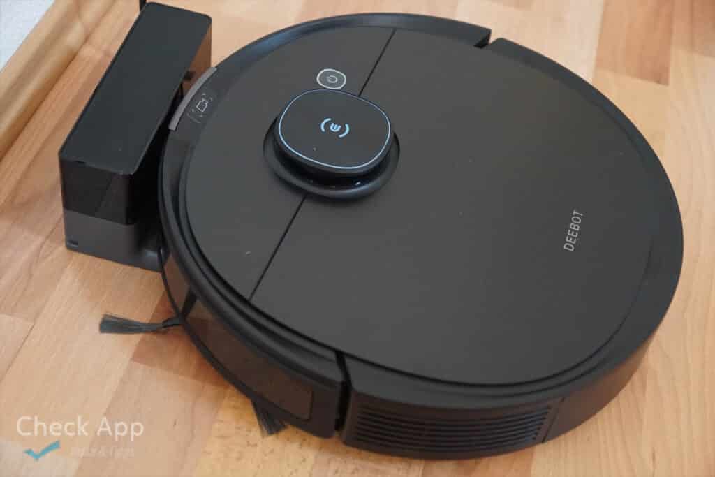Der Deebot ist mit seinen 35 Zentimetern im Durchmesser und 9 in der Höhe mit „üblichen Maßen. Auch das Design selbst hält sich an die bewährte Rundform. Die Oberseite aus Plastik hat eine matte Optik von gebürstetem Aluminium, doch nur der Laserturm selbst hat eine metallene Abdeckung. Hier findet sich das blau der Marke wieder. Es gibt nur eine beleuchtete Taste, unterm Deckel einen Einschalter, wo auch der 300 ml Schmutztank nach oben hin mit kleinen Henkel entfernt werden kann. Dort raus schaut auch die Kurzanleitung, mit welcher man in 9 Schritten den Roboter auf seine erste Reinigung mit Kartierung schicken kann per App.