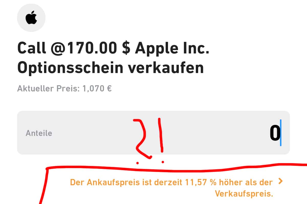 11,57 Prozent sei der Spread, der Ankaufspreis so viel höher als der Verkaufspreis. So informierte kürzlich Trade Republic über einen Optionsschein. Dieser stammt von der UBS und man spekulierte damit auf steigende Kurse bei Apple. Klar, das war nach den sehr guten Quartalszahlen und mit dem hohen Spread wollte die Bank offenbar ihr Risiko reduzieren. Hätte ja sein können, dass die Apple Aktie überdurchschnittlich steigt. Dennoch darf man bei so einem Marktereignis mal fragen, weshalb der Spread bei Trade Republic so hoch war.