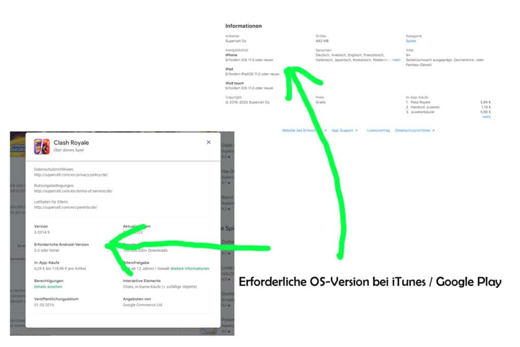 - Inkompatible Betriebssystemversion: Ein weiterer Grund für eine Installationsblockade ist die Inkompatibilität der App mit der aktuellen Version des Betriebssystems auf dem Gerät (OS-Version). Entwickler veröffentlichen oft Updates für ihre Apps, die möglicherweise nur mit bestimmten Betriebssystemversionen kompatibel sind. Wenn Ihr Gerät eine veraltete Betriebssystemversion verwendet, können Sie die App möglicherweise nicht installieren, bis Sie das Betriebssystem auf die neueste Version aktualisieren. Finde die erforderliche OS-Version in den Stores heraus, bei iTunes ganz unten bei Informationen, bei Google Play musst du erst das auf „Über dieses Spiel / Über diese App“ öffnen und hier runter scrollen.